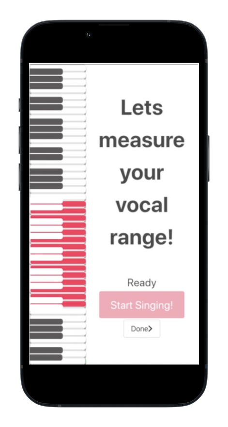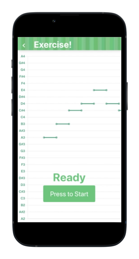 Developed a vocal training app with personalized practice sessions. It determined users' vocal range and suggested suitable songs/exercises. Users followed emitted pitches, with their pitch tracked, displayed, and compared on a real-time graph. Performance was then graded and saved results for progress tracking.